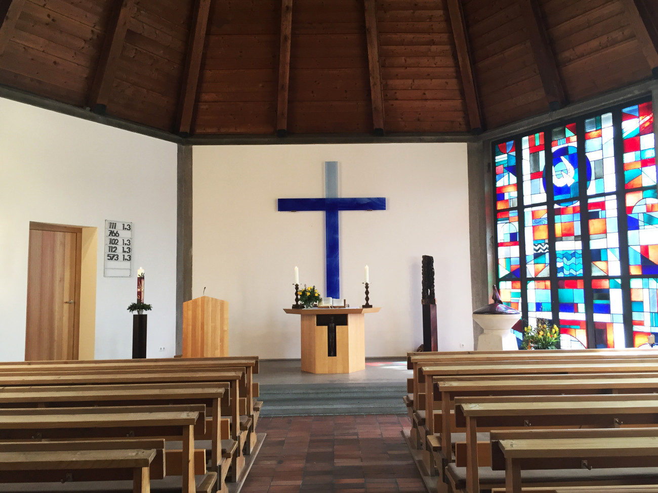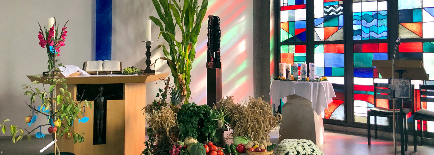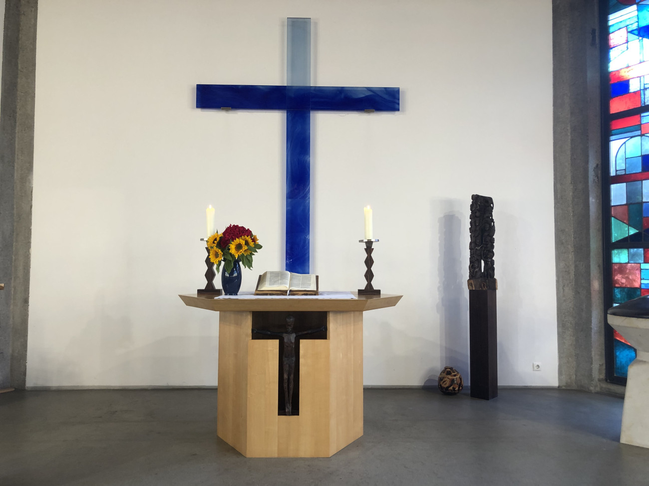 Der sechseckige Altar nimmt die Grundform der Kirche auf. Im Altarsockel steht der aus Ebenholz geschnitzte Christus aus Tansania als Träger der Abendmahlsgemeinschaft. Die Kerzenleuchter, ebenfalls aus Ebenholz, erinnern in Verbindung mit dem Kreuz an der Wand an Maria und Johannes unter dem Kreuz.