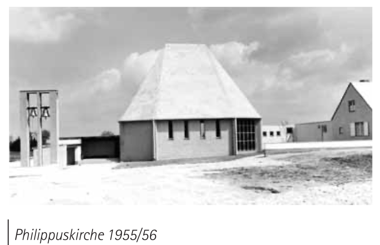 1953 war die Grundsteinlegung der Kirche und eines Pfarrhauses. Am 25.Juni 1954 wurde der hochragende Dachstuhl der Kirche gesetzt. Durch die großen Eigenleistungen der Gemeinde konnte die feierliche Einweihung der Philippuskirche mit Vikarswohnung und Gemeindesaal am 22. Mai 1955 stattfinden. Aus dem bisherigen Pfarrvikariat entstand 1962 eine eigenständige Pfarrei.