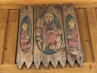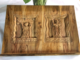 Aus Bethlehem stammt die kleine Auflage für die Altarbibel. Christliche Palästinenser haben in Olivenholz zwei biblische Gestalten geschnitzt, die mit Gott und für ihn unterwegs waren: Abraham und Philippus, den Namenspatron der Kirche. Für Philippus bildete die Figur im Altarraum der katholische Kirche St. Margaret die Vorlage.