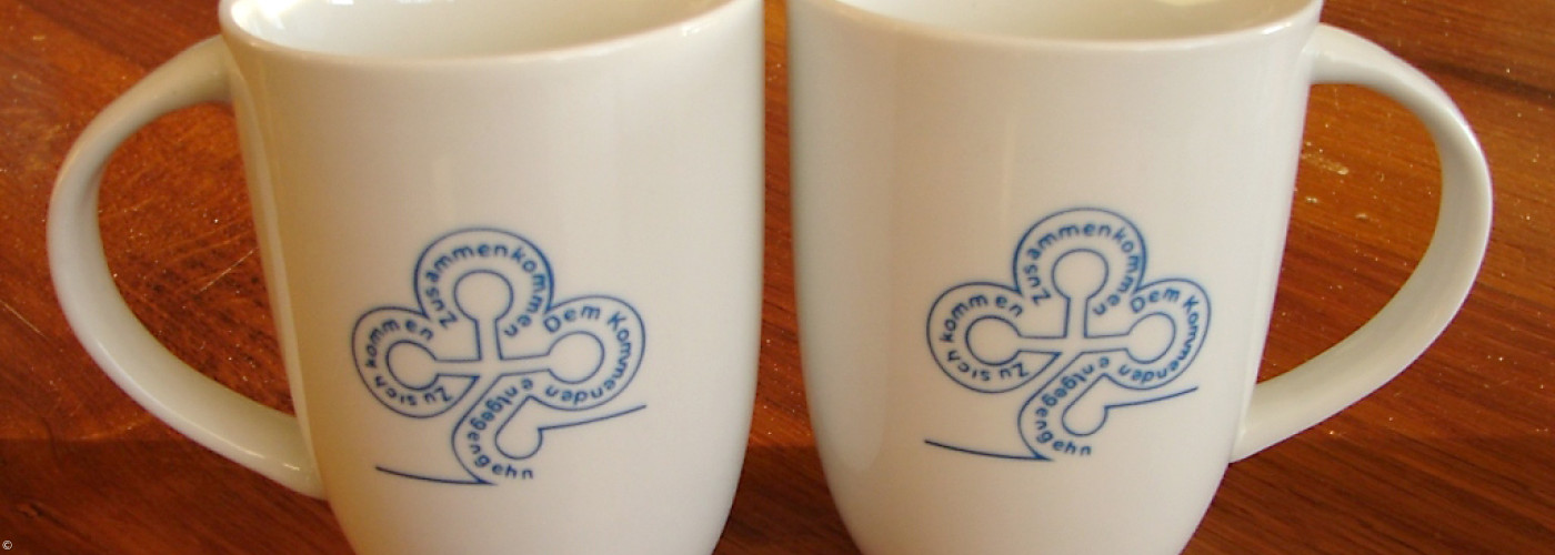 Im Rahmen des Fundraising zum Neubau des Gemeindezentrums gab es 2015 eine Gemeindetasse mit dem Logo.