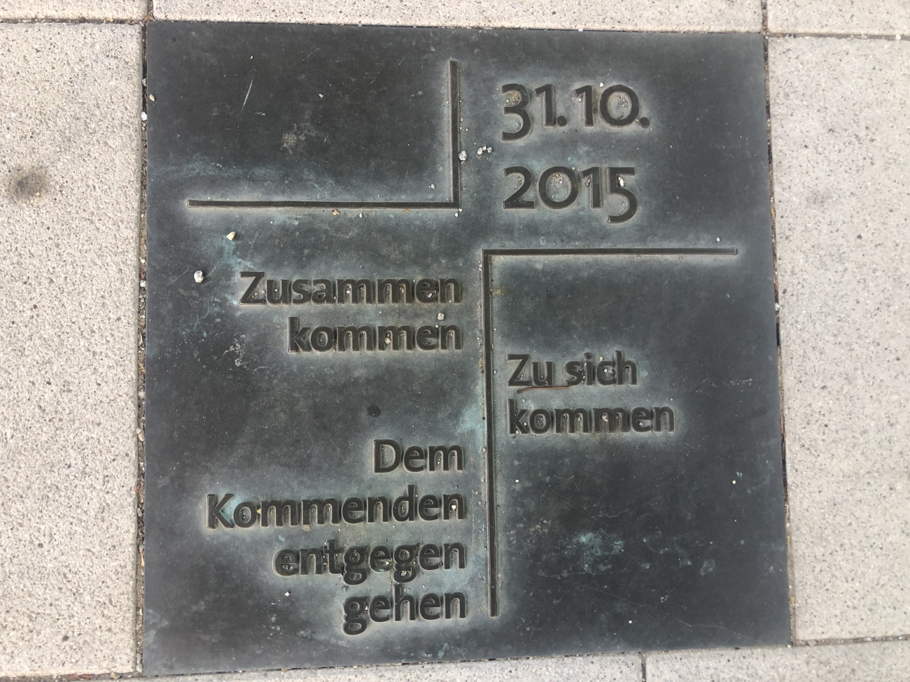 Der Spruch des Logos steht auch auf dem Grundstein für das neue Gemeindezentrum. Dieser ist im Innenhof zu finden.
