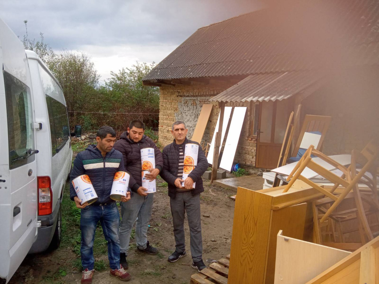 Pastor Ivan X und Helfer nehmen Möbel und Lebensmittel in Sjurte in Empfang
